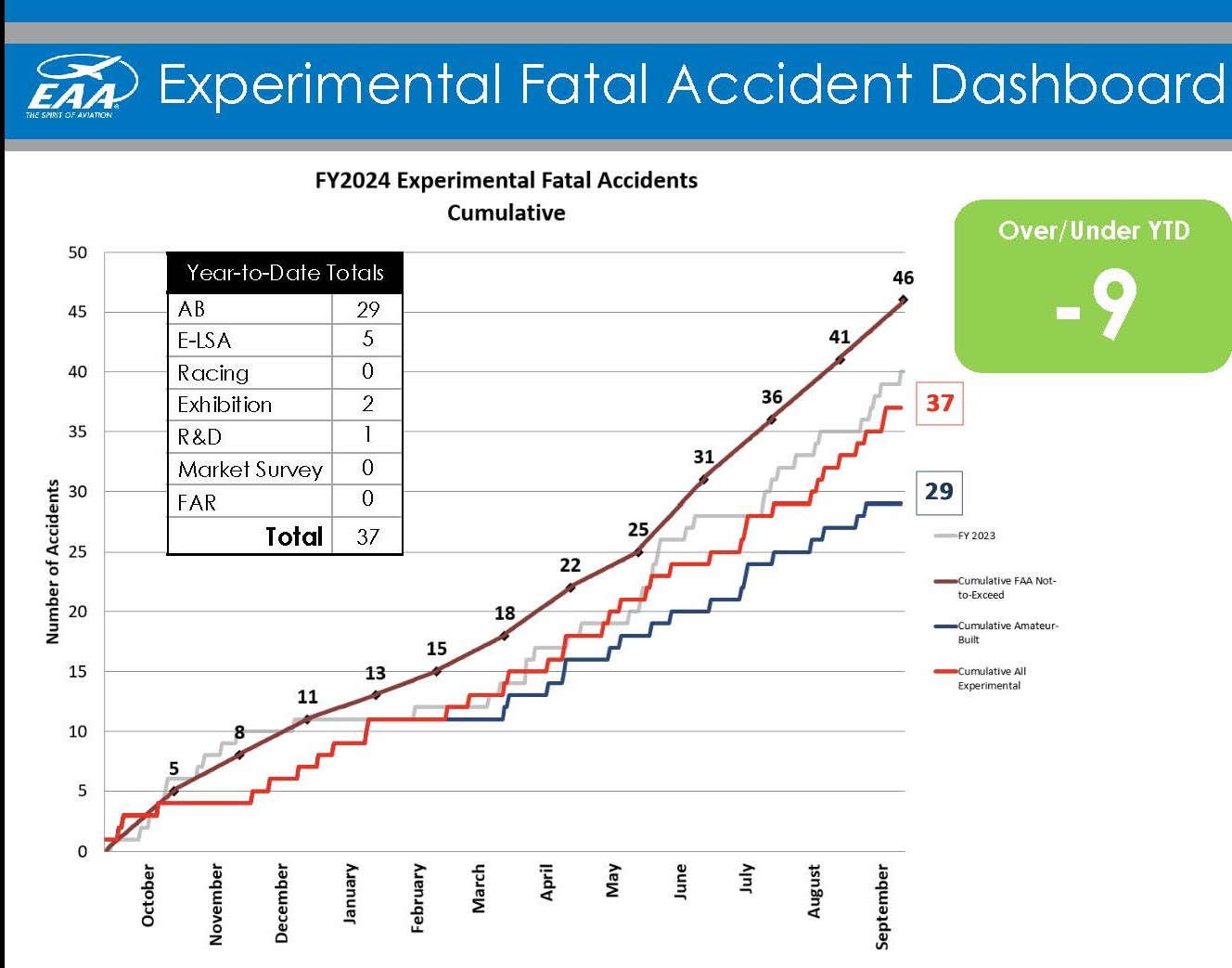 For the federal fiscal year ending September 30, 2024, the Federal Aviation Administration reported there were 37 fatal accidents in experimental category aircraft over the preceding 12 months, including 29 in amateur-built aircraft. The FAA during that period also maintained a continually lower not-to-exceed goal each year, with the total fatal accidents well below the most recent goal of 46 for the period ending in September 2024. That compares to 61 total accidents – 40 in amateur-built aircraft – during a similar 12-month period a decade ago.